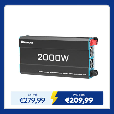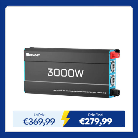 Onduleurs « batterie » sont conçus pour convertir simplement le DC en AC afin de faire fonctionner des appareils domestiques typiques dans votre camping-car. La gamme Renogy gère des charges de 700W, 1000W, 2000W et 3000W, respectivement. À mesure que la puissance augmente, le prix augmente aussi, ainsi que la consommation propre de l’onduleur.