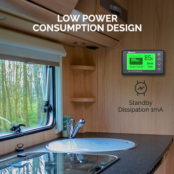 Le rétroéclairage s’éteint automatiquement lorsque le courant de charge est inférieur à 100 mA, avec une consommation en veille de seulement 1 mA. Ce moniteur de batterie est équipé d’une fonction de stockage des données, sauvegardant automatiquement les dernières mesures lorsqu’il est hors tension.