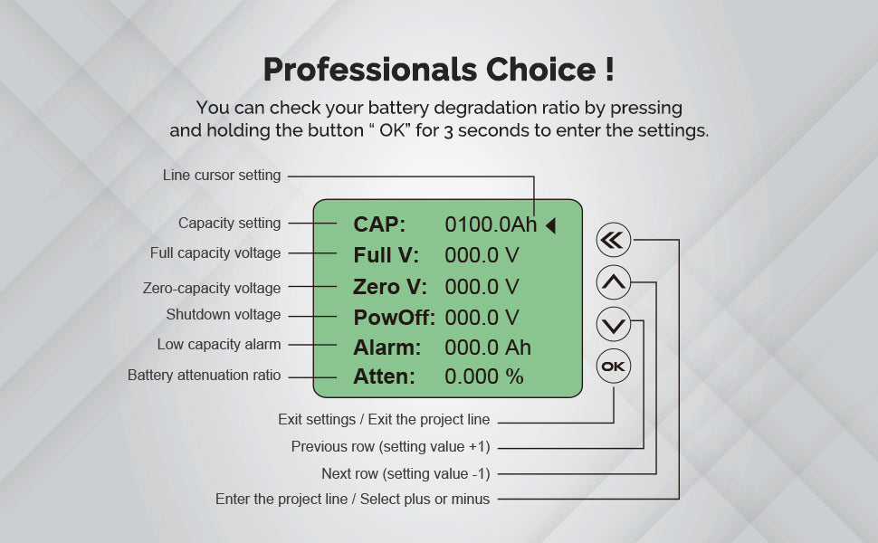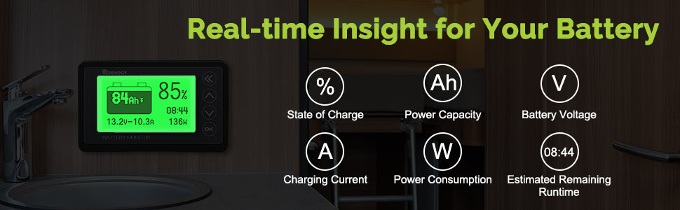 Ce moniteur offre une détection de courant haute précision et un état de charge de la batterie fiable. Vous pouvez également définir une alarme pour une tension trop haute ou trop basse. Lorsque l’alarme est activée, le rétroéclairage et la valeur de tension s’affichent à l’écran afin de vous alerter sur les actions à entreprendre lorsque la tension de coupure est atteinte.