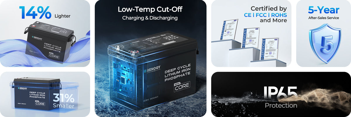Caractéristique : 12,8V 300Ah chacune ; BMS 200A ; coupure charge/décharge basse température ; IP65 ; jusqu’à 1/3 plus compacte qu’une batterie plomb équivalente ; certifications UN38.3/FCC/RoHS/UKCA ; garantie 5 ans. Avantage : Avec 4 batteries en parallèle, chaque unité ne supporte qu’environ 65A sous forte demande, ce qui réduit la chauffe et la chute de tension. Bénéfice : Fonctionnement stable pour les appareils AC 3000W (cafetière, micro-ondes) et durée de vie prolongée du système batterie.