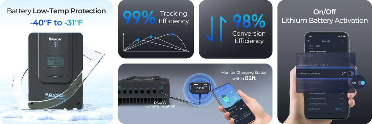 Caractéristique : Suivi MPPT 99 % / conversion maximale jusqu’à 98 % ; compatible 12/24/36/48 V ; protections complètes intégrées. Avantage : Un array d’environ 800 W correspond parfaitement à la plage optimale du contrôleur, assurant une recharge plus rapide par beau temps. Bénéfice : Fenêtres de recharge plus courtes, autonomie solaire accrue et planification quotidienne plus flexible.
