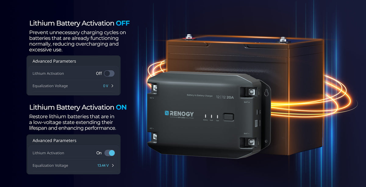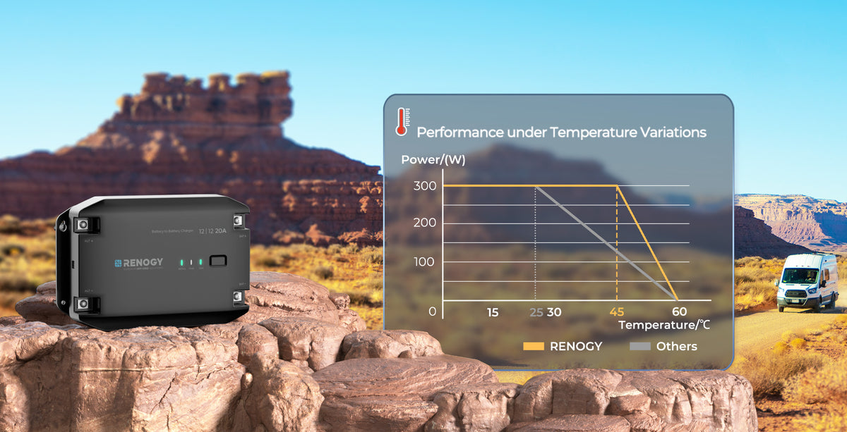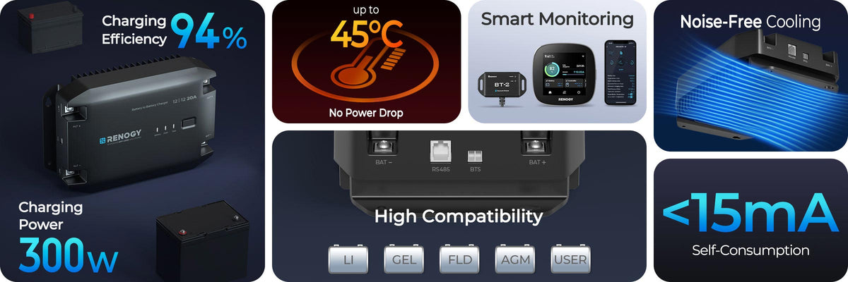 Que vous partiez à l’aventure en plein air ou que vous adoptiez simplement la vie en van, le chargeur de batterie DC-DC Renogy 12V 20A est un compagnon fiable pour une charge efficace et performante.