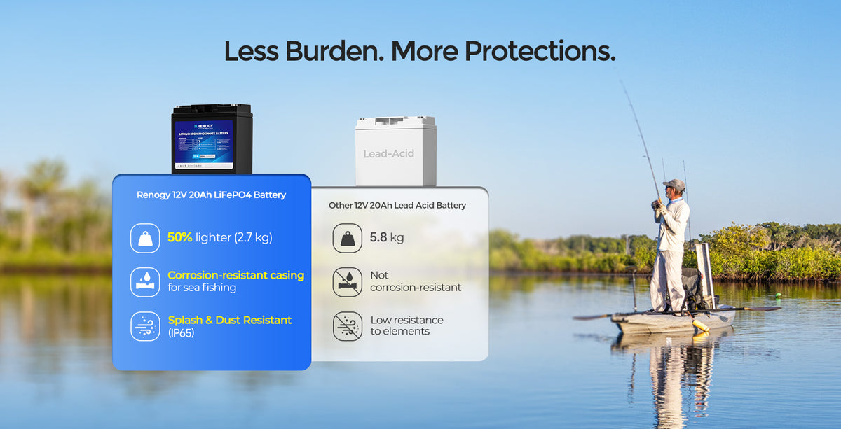 Deux fois plus légère qu’une batterie au plomb classique, la batterie Renogy 12V 20Ah LiFePO4 Série TM offre robustesse et fiabilité. Conçue pour résister aux éclaboussures, à la poussière et à la corrosion, elle vous accompagne sereinement lors de vos sorties en mer ou en rivière.