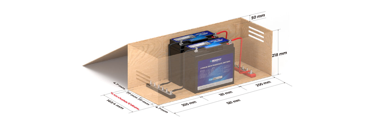 Avant d’installer la batterie, veillez à laisser un espace libre de 50 à 100 mm (1,97 à 3,94 po) au-dessus de la batterie. Du côté des barres omnibus (busbars), prévoyez au minimum 200 mm (7,87 po).