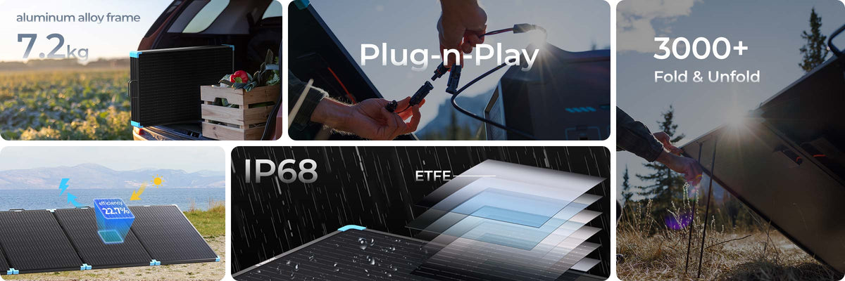 - Installation express en 1 minute : connecteurs solaires IP68 et béquilles en aluminium robustes.