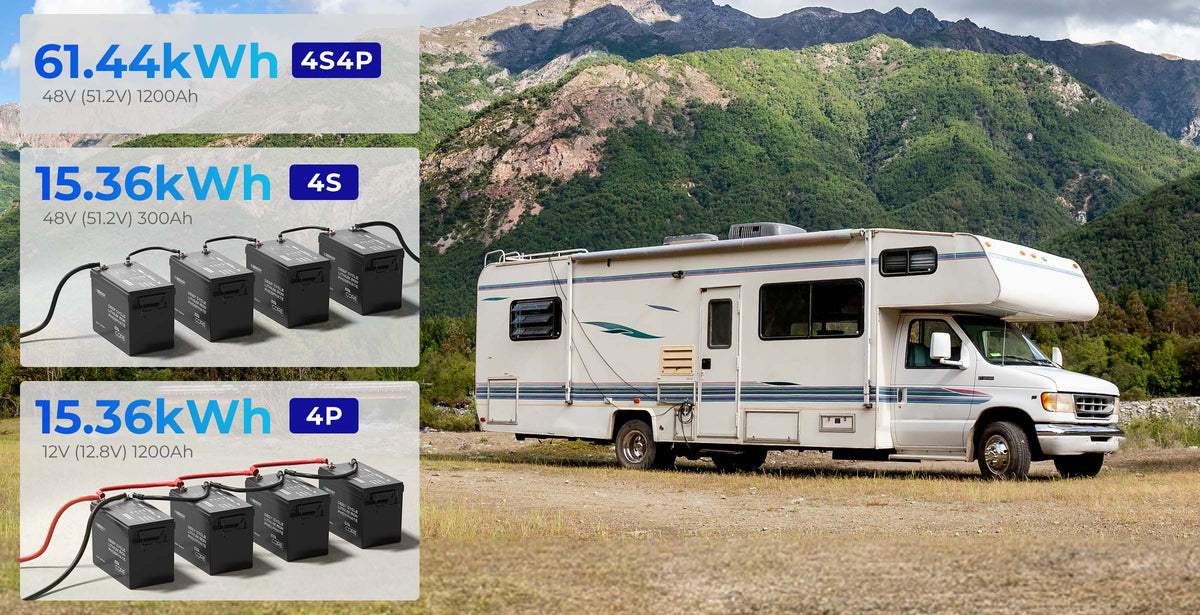 Adaptez votre installation électrique selon vos besoins spécifiques. Vous pouvez connecter jusqu’à quatre batteries en série, quatre en parallèle, ou combiner les deux configurations pour créer une solution d’alimentation sur mesure.
